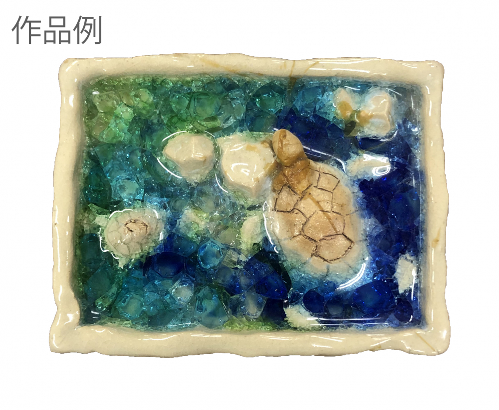 釉薬のようには掛けず、施釉済みの平皿や陶盤など平たい器の底に敷きます。綺麗なガラス溶け溜まり、作品にアクセントを付けられます。
