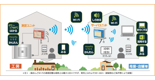 ・窯おんどWi-Fi通信距離は規格上は最大100mですが、実用上はおおよそ50~60m(遮蔽物など条件等により変動します)