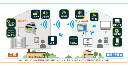 ・窯おんどWi-Fi通信距離は規格上は最大100mですが、実用上はおおよそ50~60m(遮蔽物など条件等により変動します)